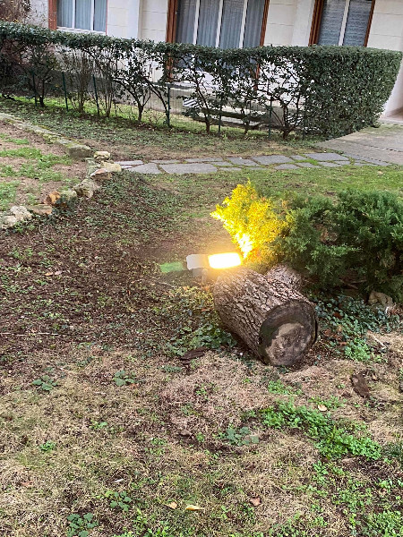 Notre intervention a commencé par le remplacement du projecteur situé près du cèdre, en choisissant le modèle "Vittel". Ce spot sur patère et piquet de 6W, en noir, issu de la gamme "Itras", a été sélectionné pour sa capacité à mettre en valeur la silhouette de cet arbre majestueux.